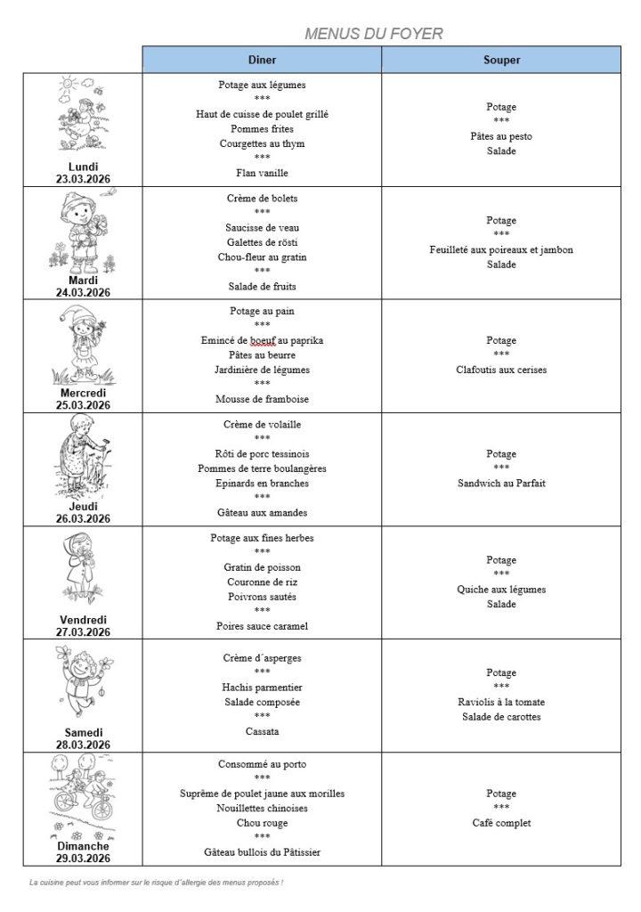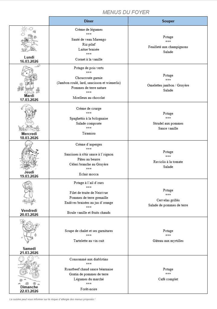 Vous avez également la possibilité de dîner à la cafétéria. Inscription au  026 414 96 15 (cuisine) jusqu’à 09h00 le jour même.